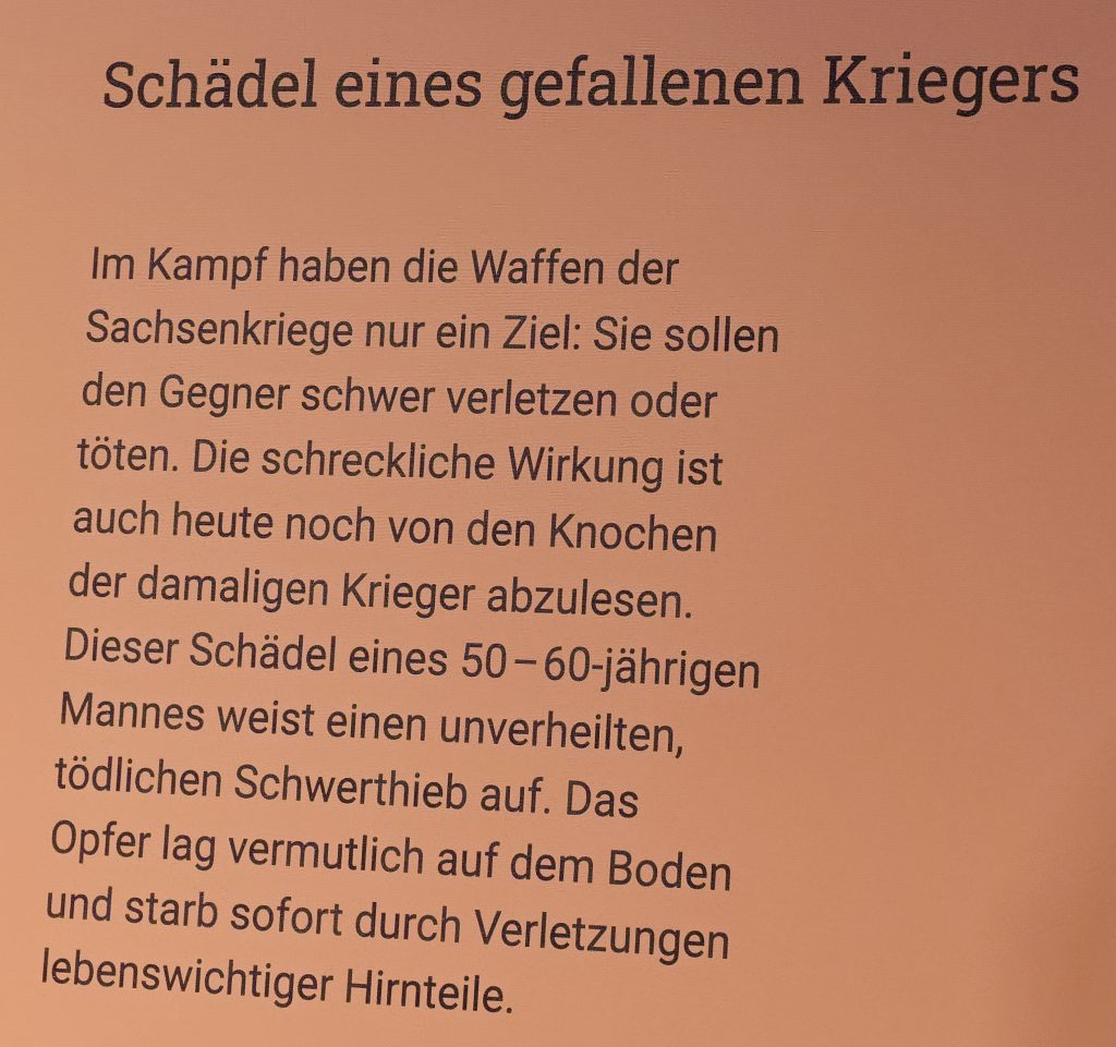 Ein spannender Teil der Ausstellung, dass es zwei digitale Erlebnisstationen gibt. Mit Virtual-Virtual-Reality-Brillen kann man sich in diese Zeit begeben. Zwei Szenen sind durch „die Brille“ zu sehen: Einmal die Schlacht am Brunsberg im Jahr 775 und als zweitens eine Szene, wie die fränkischen Eroberer mit Sachsen über Bestattungsriten sprechen. Kurze Erklärung zu den Bestattungsriten: die christlichen Franken beerdigten ihre Toten in Särgen und verboten den Sachsen, ihre Verstorbenen weiterhin zu verbrennen.