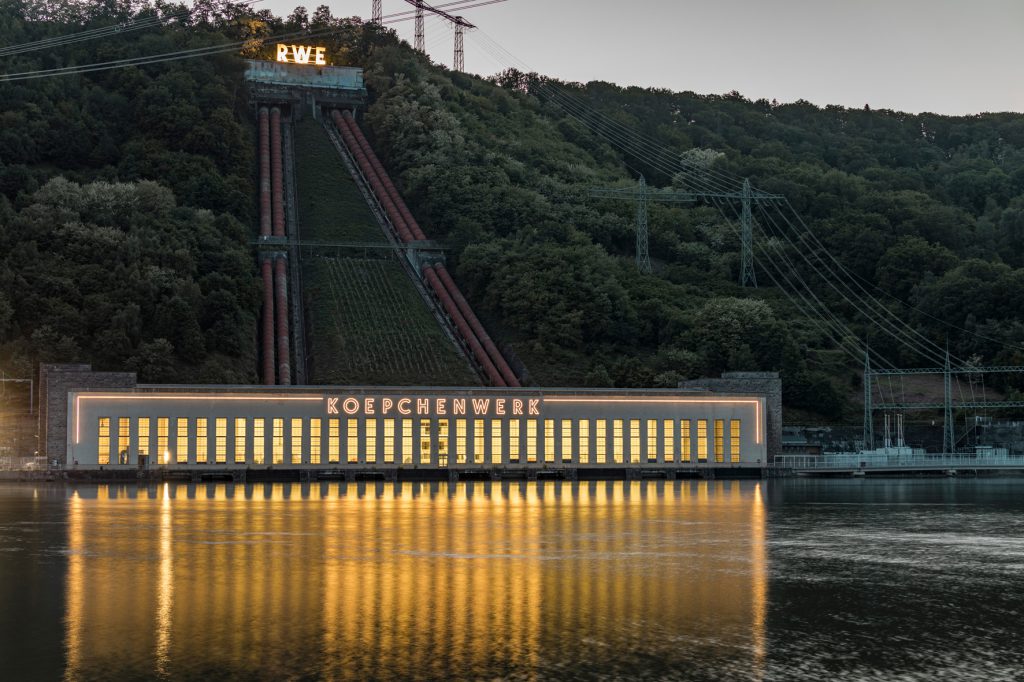 Die Reaktivierung der historischen Beleuchtung am Pumpspeicherkraftwerk Koepchenwerk in Herdecke ist abgeschlossen. Der Schriftzug „KOEPCHENWERK“ kann jetzt wieder allabendlich an der Fassade der historischen Maschinenhalle leuchten und verwandelt das hochrangige Industriedenkmal damit in eine Lichtlandmarke – ganz so, wie einst auf alten Fotografien aus der Betriebszeit des Kraftwerks. Im Rahmen eines Pressegesprächs wurden die Buchstaben heute feierlich eingeweiht.