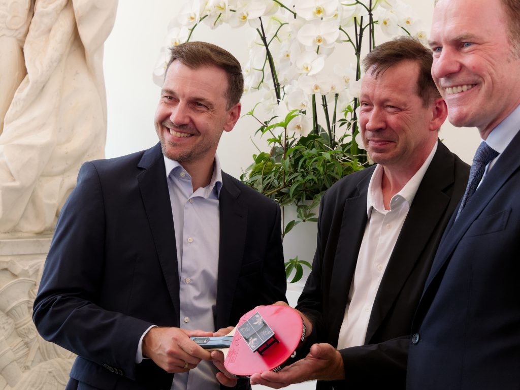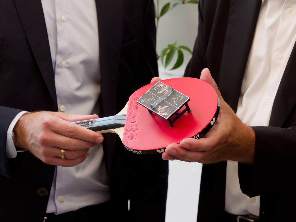 Am Ende seiner Rede hatte der Oberbürgermeister eine besondere Überraschung parat: Gemeinsam mit dem Sportamt hat D.SPORTS eine besondere Tischtennisplatte zu Ehren von Timo Boll gestaltet. Diese wird am 22. August 2025 im Düsseldorfer Hofgarten offiziell eingeweiht. Eine bereits vorhandene Platte im Bereich des Kinderspielplatzes wird dafür mit dem Porträt von Timo Boll und einer Übersicht seiner größten Erfolge geziert. Als besonderes Highlight erhielt Timo Boll zudem eine Miniaturversion der gestalteten Platte als persönliches Andenken, die ihm von OB Dr. Stephan Keller und Stadtdirektor Burkhard Hintzsche überreicht wurde.