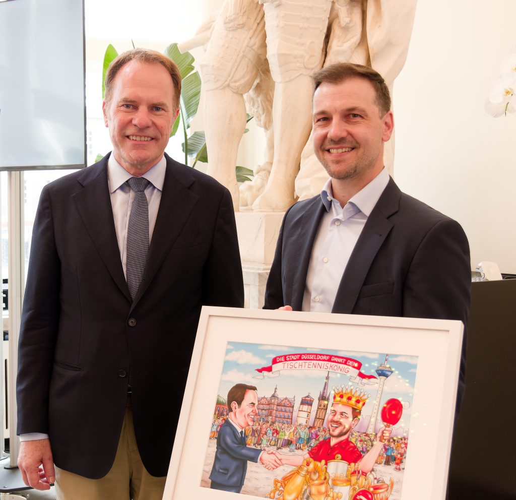 Die Würdigung wurde durch ein weiteres Geschenk des Oberbürgermeisters ergänzt: ein eigens von Jacques Tilly gemaltes Bild. Es zeigt den Oberbürgermeister und Timo Boll, umgeben von seinen zahlreichen Pokalen vor einer Düsseldorfer Stadtkulisse. Über dem Motiv steht der Schriftzug „Die Stadt Düsseldorf dankt dem Tischtenniskönig“.