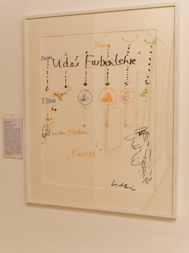 Einzigartig ist, dass die Ausstellung mit ganz frühen, noch nie ausgestellten Zeichnungen und Skizzen die Entwicklung seines unkonventionellen Stils nachvollziehbar werden lässt. Schon auf dem Album livehaftig von 1979 zeichnet sich Udo selbst auf das Innencover, dem Album Götterhämmerung legt er 1984 ein in reinen Konturlinien gezeichnetes Poster bei. Aus den Udogrammen heraus erwächst ein fantastischer Kosmos mit dem Panikpräsidenten an der Spitze.