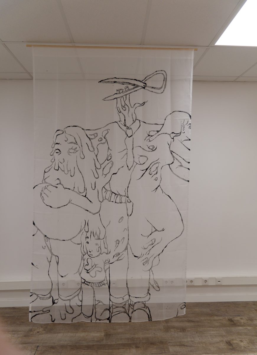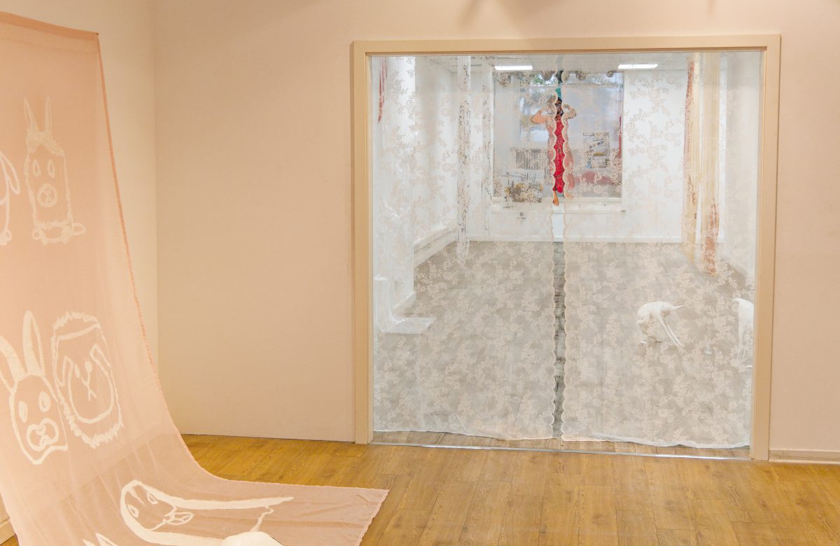 Warum der Titel der Ausstellung „the curtains we live in“ heißt, warum überhaupt Vorhänge, erklärt Ihnen Aylin (Studentin der Kunstakademie Düsseldorf).