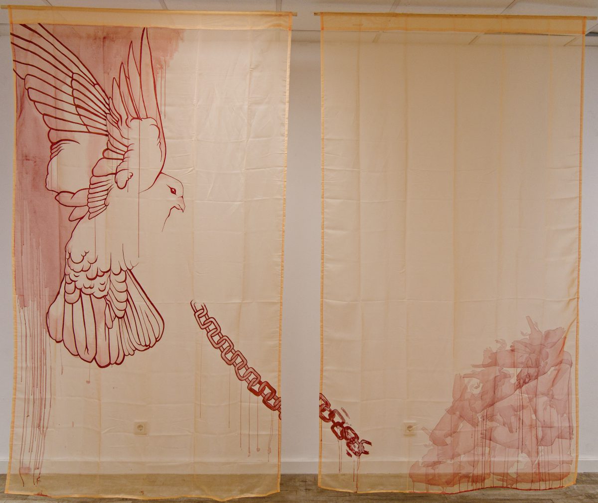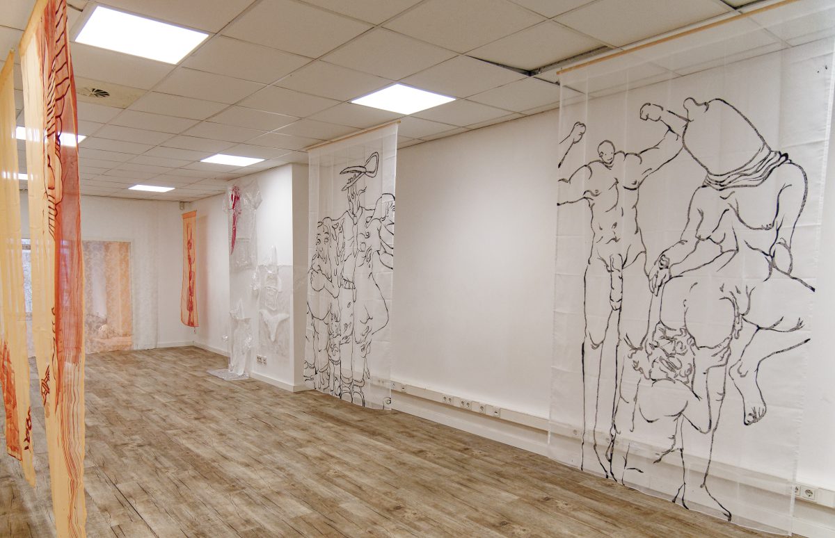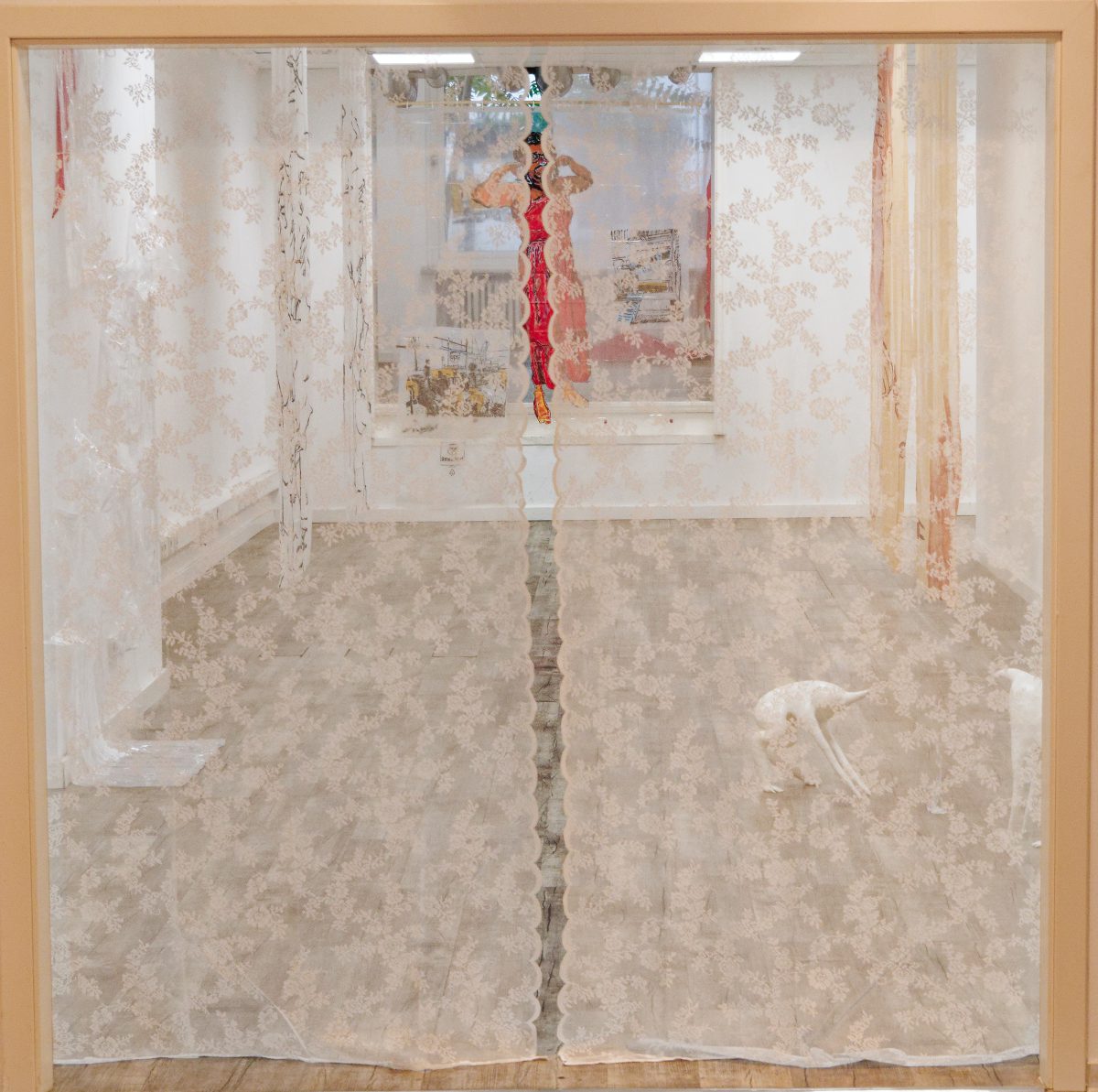 Diese Vorhänge erlauben anhand ihrer Transparenz, den Durchbruch von Barrieren und fördern Interaktionen, sowohl mit dem Raum als auch miteinander. Organische Überschneidungen der Werke resultieren in einem dynamischen Gewebe aus vielschichtigen Erfahrungen, Erinnerungen und Erwartungen.