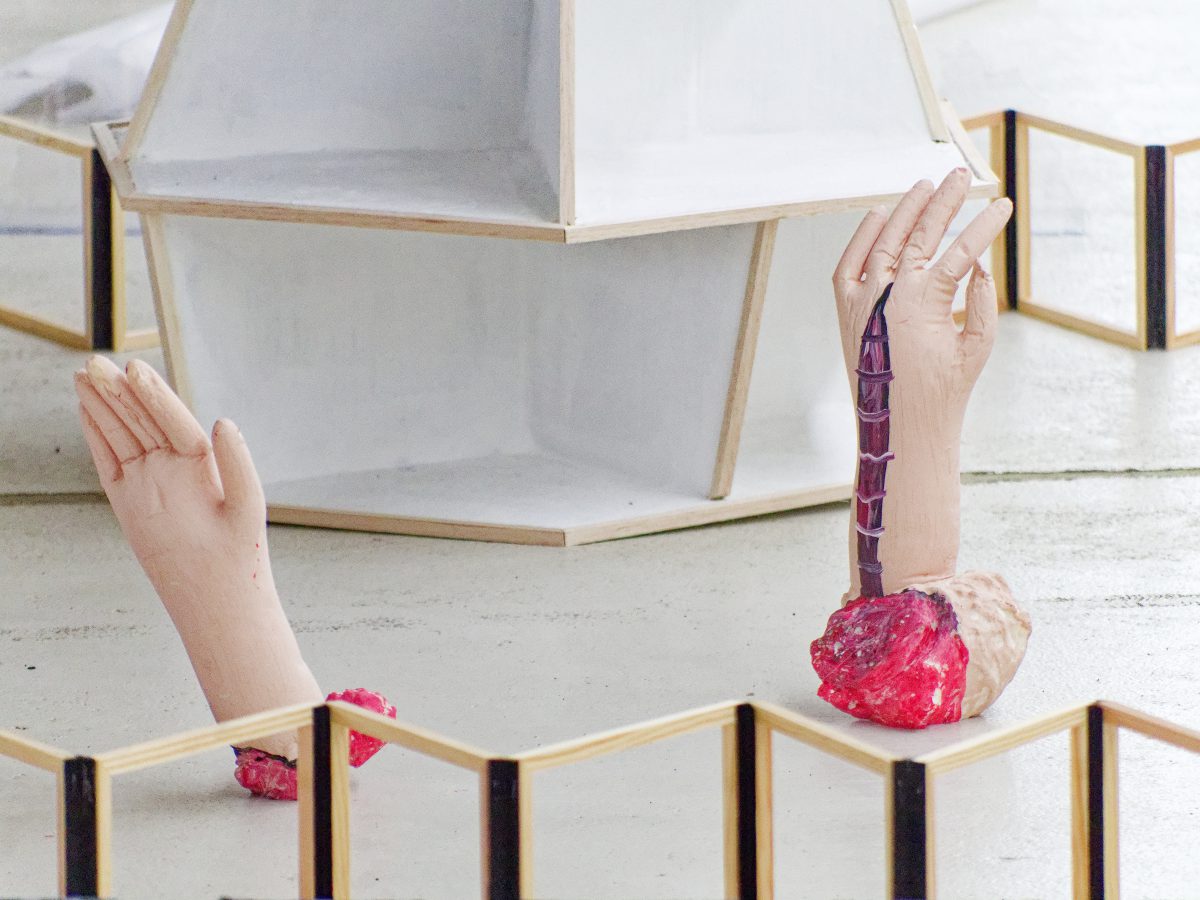 In ihrer Ausstellung restraumraumrest verwebt die Künstlerin und Autorin Miriam Bornewasser Film, Skulptur und Wort zu einer Geschichte des KIT und lässt dabei auch Gedanken zu Resträumen im Allgemeinen einfließen. Diese sind scheinbar nutzlose architektonische Überbleibsel, entstanden durch Bauplanungen und -regeln. Zu finden sind sie – wie der Restraum KIT – zwischen Tunnelröhren, aber auch unter Brücken, neben stillgelegten Bahngleisen oder zwischen Gebäuden.