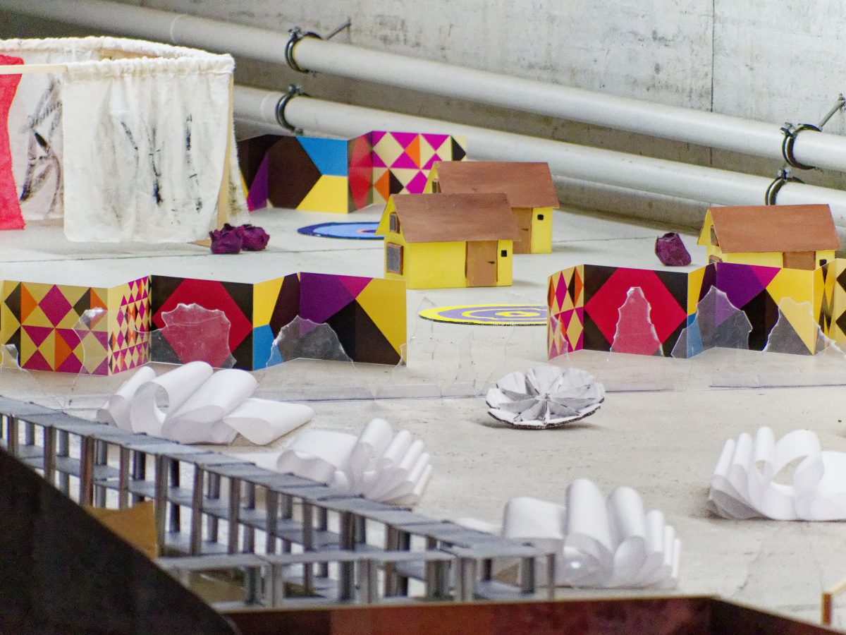 Einige Vorhänge versperren die Sicht auf den offenen Bereich des KIT. Auf zwei der Stoffbahnen, die vage an Baustellenplanen erinnern, sind Projektionen zu sehen. Sie sind mit nicht mehr noch nicht betitelt und laden zur Reflexion über verschiedene Arten von Resträumen und Brachflächen ein. Auf zwei Bahnen lesen wir projizierte fragmentarische Gedichte zu diesen Orten, die andere Projektion zeigt außerdem in Modellen gefilmte Versionen dieser Räume.