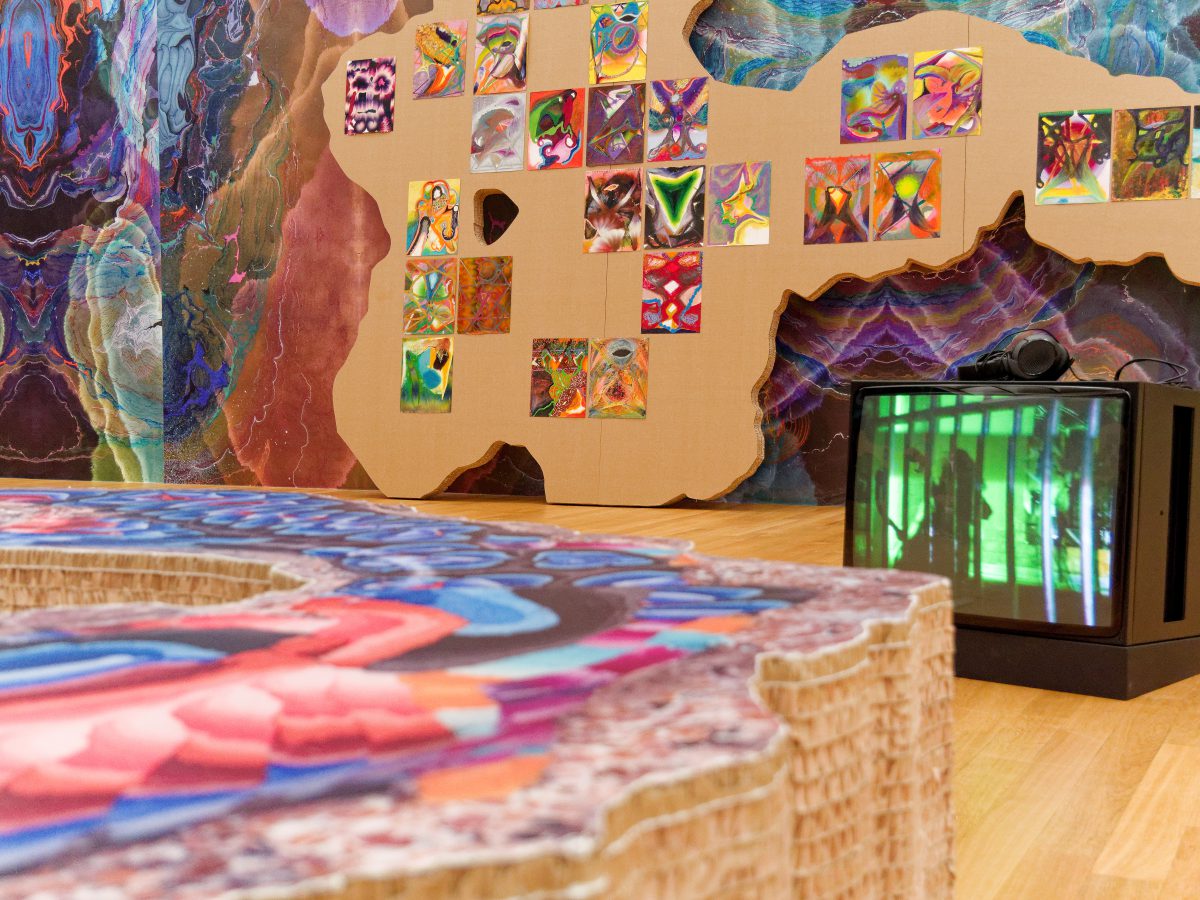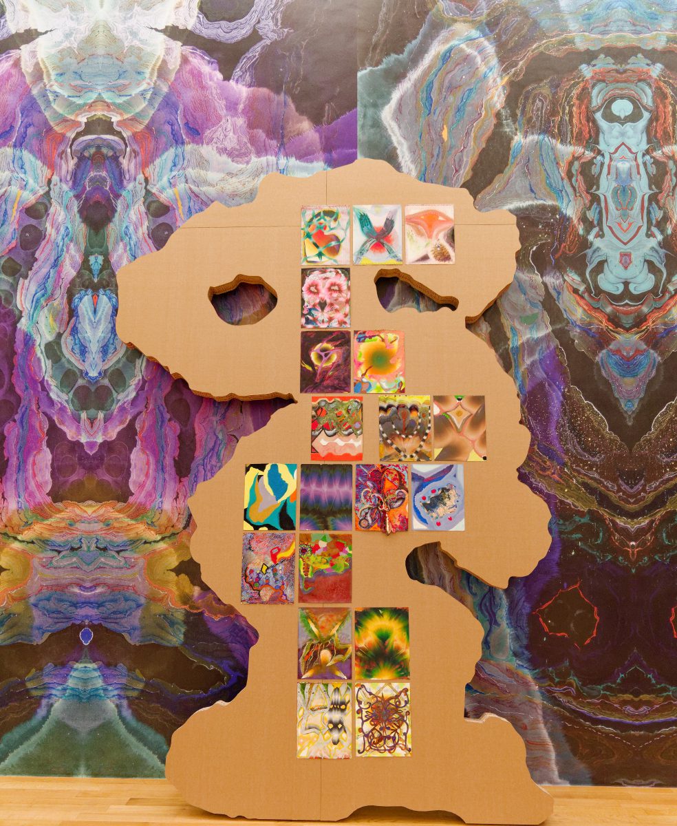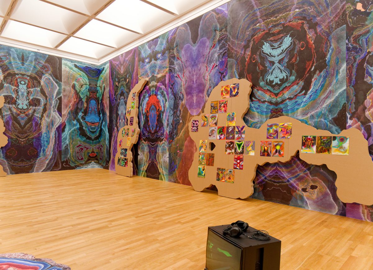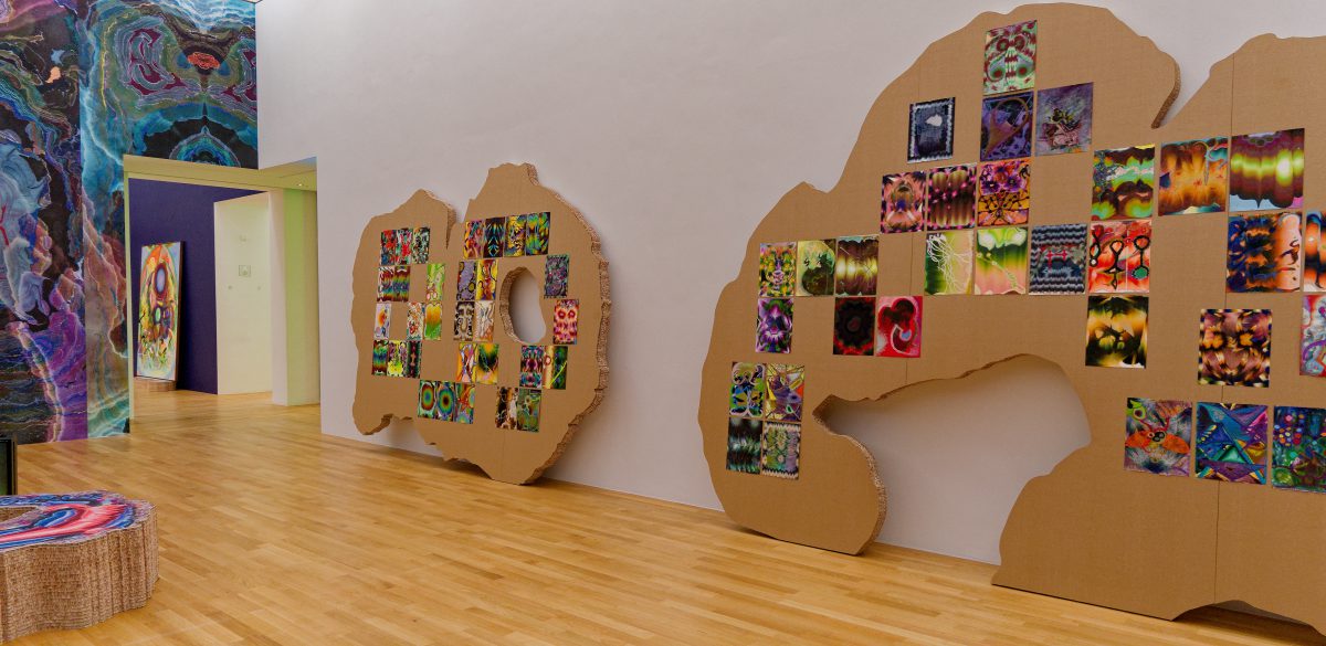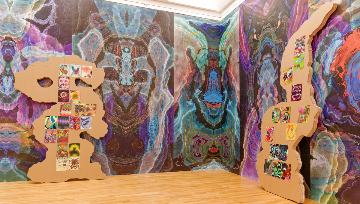 Für die Ausstellung verwandelt Kerstin Brätsch das Kunstmuseum Bonn in einen lebendigen malerischen Organismus. Zentraler Ausgangspunkt ist dabei der Bezug zwischen Malerei und Körper auf physischer, psychischer und sozialer Ebene. Wie ein Portal zu einer anderen Welt durchschreiten die Besuchenden eine Art Labyrinth aus Farbe, Licht und Klängen oder treten vor eine suggestive Tapete mit gespiegelten Motiven, die an die Tintenklecks-Tests des Psychiaters Hermann Rorschach erinnern.