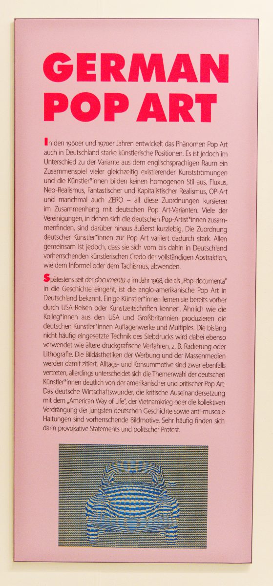 Das zumeist mit dem englischsprachigen Raum verknüpfte Phänomen der Pop Art findet auch in Deutschland in den 1960er und 1970er Jahren starke künstlerische Positionen. Diese unterscheiden sich vor allem in der Themenwahl deutlich von den amerikanischen und britischen Varianten. Vordergründig zwar an Massenkultur und Werbung orientiert, liegt den Arbeiten der deutschen Künstler*innen aber nicht der ungebrochene Optimismus ihrer englischsprachigen Kolleg*innen zugrunde. Alltags- und Konsummotive sind ebenfalls Gegenstand ihrer Kunstwerke, doch sind diese hauptsächlich geprägt durch eine provokative Haltung sowie Kritik am politischen Zeitgeist, Anti-Kriegs-Haltungen und deutscher Vergangenheitsbewältigung.
