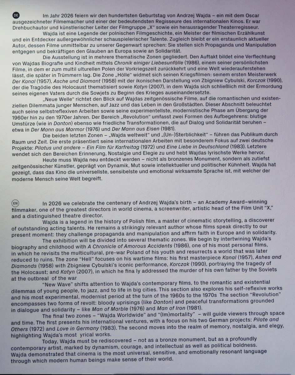 Die Sonderausstellung „Andrzej Wajda: Exhibition“ im Filmmuseum Düsseldorf, Schulstraße 4, eröffnet am Freitag, 20. Februar 2026, um 18 Uhr. Ab Samstag, 21. Februar 2026, ist sie regulär zugänglich und läuft bis zum 30. August 2026. Die Schau zeichnet Wajdas filmisches Werk chronologisch und in thematischen Kapiteln nach, verortet es im kulturhistorischen Kontext und beleuchtet seine Bezüge zu Theater, bildender Kunst und Literatur. Konzipiert wurde die Ausstellung gemeinsam mit dem Manggha Museum in Krakau.