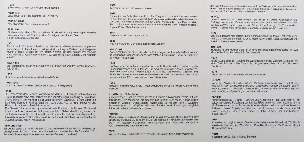 Sein vielfältiges Werk hat bis heute nichts von seiner Faszination und Strahlkraft verloren. Als einer der prägenden Künstler der deutschen Nachkriegskunst nahm Hoehme bereits seit den frühen 1950er-Jahren eine zentrale Rolle in der Entwicklung der abstrakten Malerei ein. Seine Werke nehmen bis heute eine Schlüsselrolle in der Sammlung Ströher ein. Die umfangreiche Einzelausstellung im MKM Museum Küppersmühle für Moderne Kunst in Duisburg widmet sich dem komplexen Gesamtwerk des Künstlers und bietet einen umfassenden Überblick über sein Schaffen.