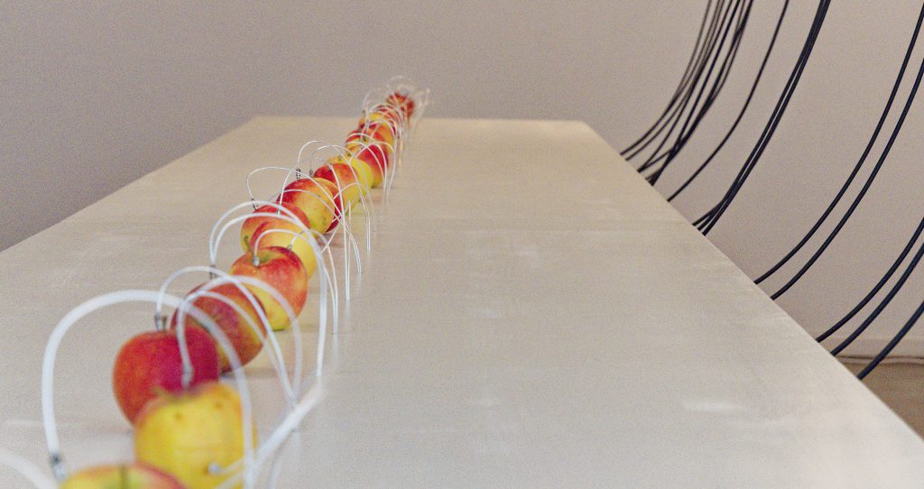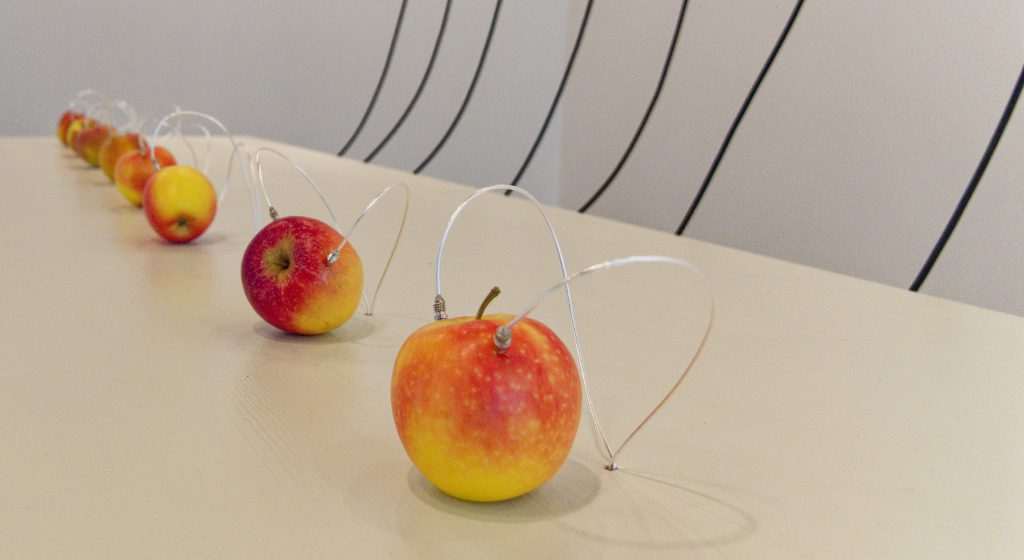 Wenn Sie möchten, können Sie an dem Kunstwerk teilhaben, indem Sie einen Apfel von den Elektroden nehmen und gegen eine neue Frucht auszauschen! (Samstags ist Obsttag und es gibt frische Früchte am Empfang.)