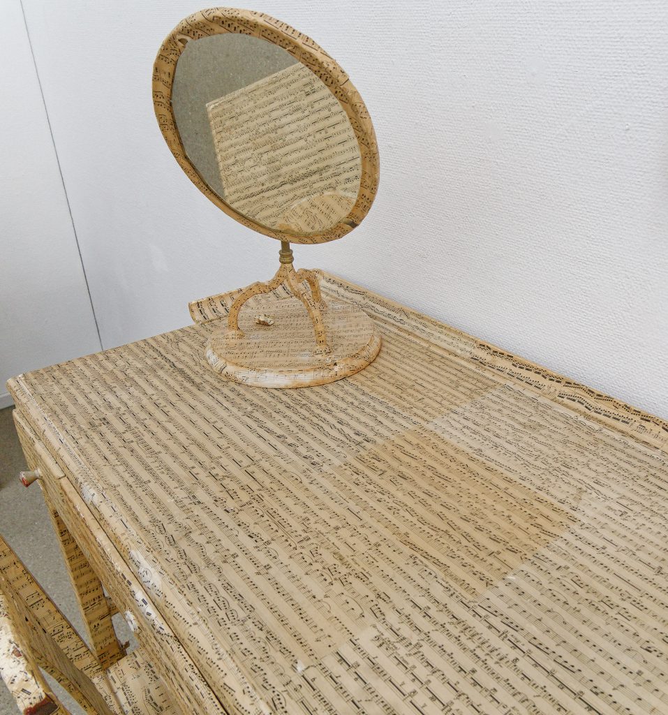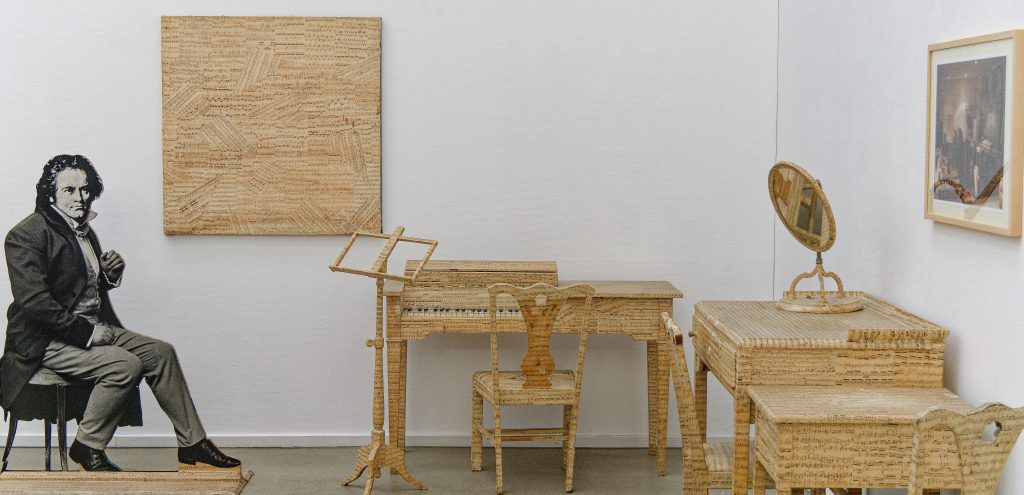 1973 waren in Inge Baeckers Bochumer Galerie und später zu den Performancewochen im Shoppingcenter RuhrPark „Klangerzeuger und Musikfiguren“ des Komponisten Mauricio Kagel (1931-2008) als Rauminstallation ausgestellt. die Musik, bildende Kunst und Theater verbanden. Ei-Arakawa-Nash inszeniert hier Fragmente der Rauminstallation von Mauricio Kagel neu. Kagel drehte Ende der 1960er Jahre den Film Ludwig van anlässlich des 200. Geburtstags Ludwig van Beethovens. Die Kulisse dafür das Musikzimmer (1970), ist als begehbare Partitur zu verstehen, ein Raum, der Interpret*innen dazu animiert, die „Musik der Vergangenheit auch als Musik der Gegenwart darzubieten“. Wie die Noten hier gelesen und interpretiert werden, beruht auf der eigenen subjektiven Wahrnehmung.