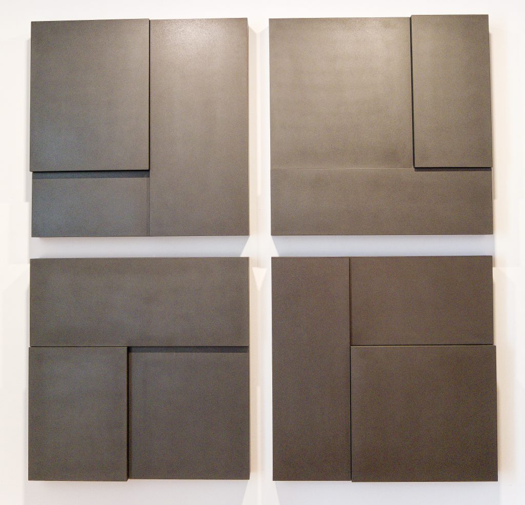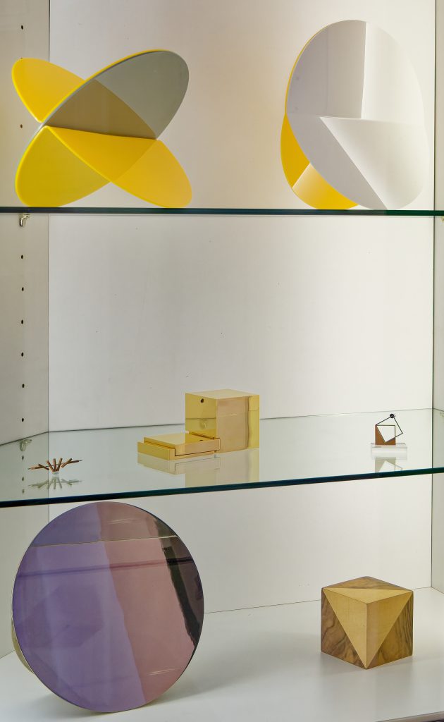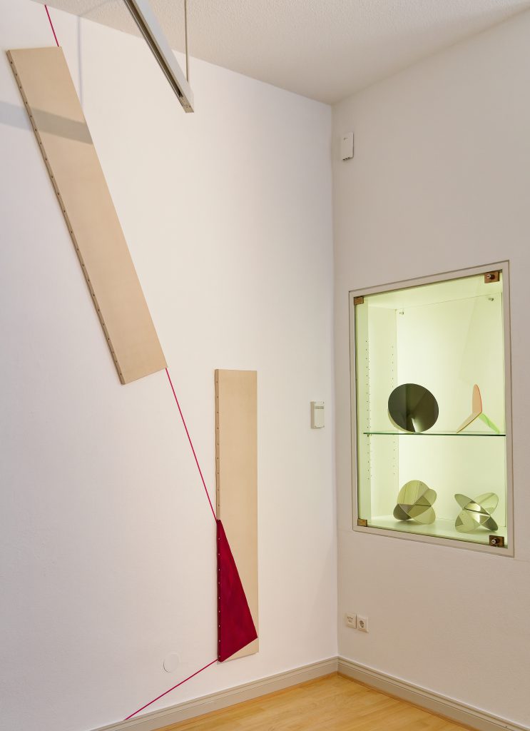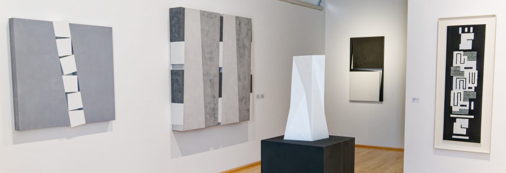 Im Erdgeschoss der historischen Villa geben Werke aus den 1960er Jahren von Josef Albers, Heinz Mack, des Op-A t „Gründungsvaters“ Adolf Fleischmann, von Walter Dexel oder Arturo Bonfanti, Einblick in die Anfänge der geometrischen Abstraktion nach 1945. Die Faltstele von Ben Muthofer im Kapellchen und Arbeiten des Künstlers Till Augustin, der kompaktes Glas mit Farbe hinterfängt oder mit einer Patina umhüllt, verbindet ihre räumliche Dynamik, die zur Bewegung vor den Objekten auffordert.