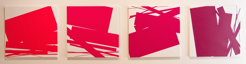 In einem Raum mit Bildern der US-amerikanischen Künstler Peter Halley und Robert Sagermann verbreiten kräftig, leuchtende Farbtöne eine vibrierende Energie. Diese tritt in ein Spannungsverhältnis zu festen Flächeneinteilungen und beeinflusst die Wirkung und Modulation der amorphen Körper von Bill Thompson.