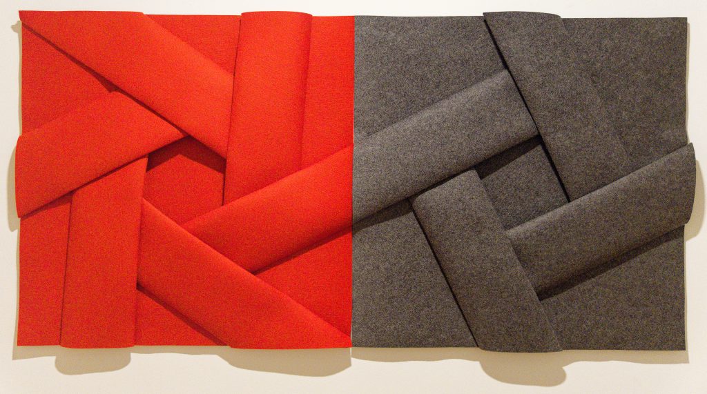 Ruhige kontemplative Räume wechseln im 1. Obergeschoss mit Kabinetten, in denen intensive Farben die Wahrnehmung herausfordern. David Ortins als auch Philip Baldwin & Monica Guggisberg verleihen grafischen Strukturen durch Wachs oder den feinen Anschliff ihrer Glaskörper eine zurückhaltende, sich langsam entwickelnde Dynamik. Eine starke Präsenz von Körper und Raum artikuliert sich in der meiserhaft gearbeiteten Filzfaltung von Peter Weber und in konstruktiv geschichteten Kompositionen von Christoph Freimann, Ernst Geitlinger oder Catherine Lee.