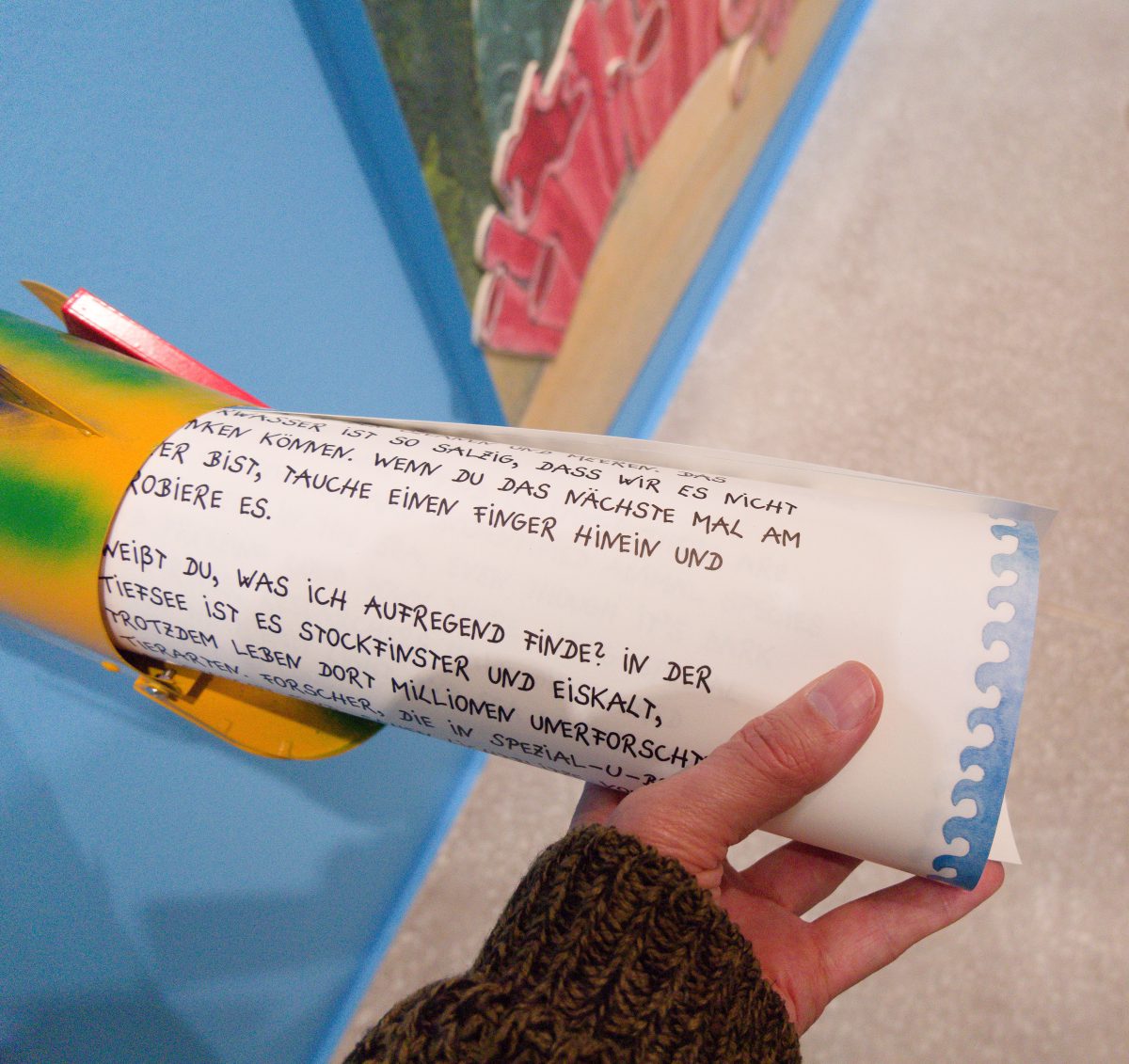 Die Ausstellung beginnt mit einer Reise zu einem der beliebtesten Urlaubsziele: dem Meer. Gemeinsam mit dem Hasen Felix tauchen Besuchende durch zahlreiche Installationen und Kunstwerke in die Wasserwelt ab. Thematisiert wird darüber hinaus die zunehmende Ver-schmutzung der Weltmeere.