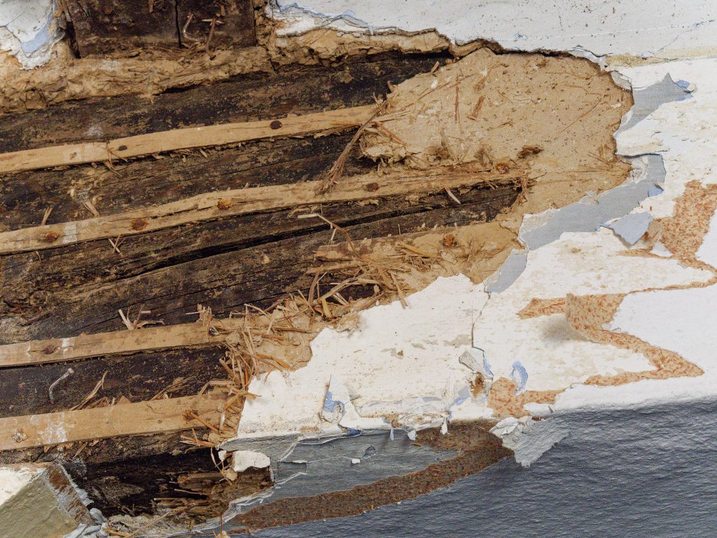 Wir sehen diesen Blauton. Das ist Ultramarin-Blau, das ist synthetisch-künstlich hergestellt worden, das gab es vorher nicht als natürliche Farbe, 1834 von Carl Leverkus. Und dann guckt man sich die ganzen Schichten an und sieht, unter dem Ultramarin liegen aber bestimmt 34 Schichten, pro Generation gestrichen. […] Der Balken ist schon sehr sehr früh gebrochen, möglicherweise schon nach dem Einbau. Wir können auf jeden Fall sagen, dieser Verputz ist ein barocker Verputz, damit sind wir im Jahr 1606. Also der Balken war schon 1606 gebrochen.