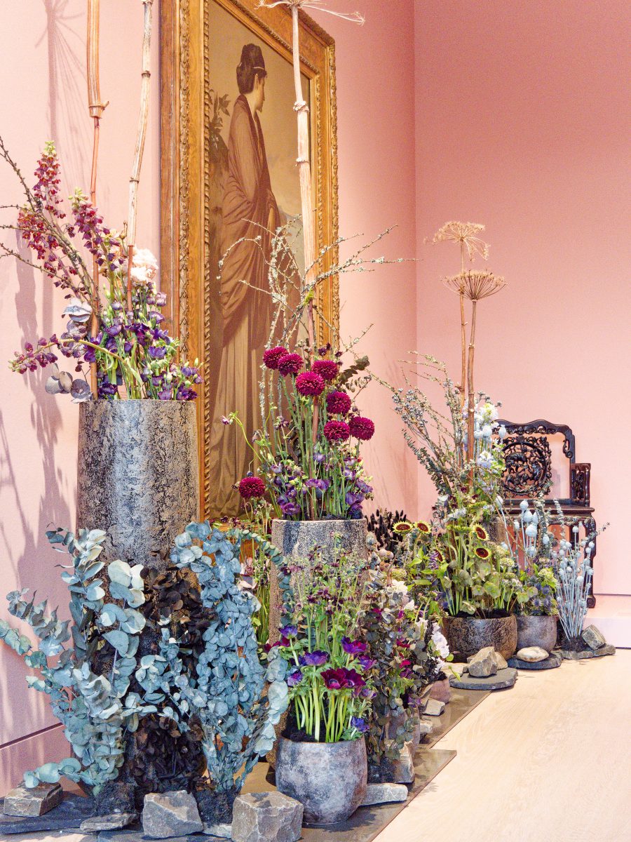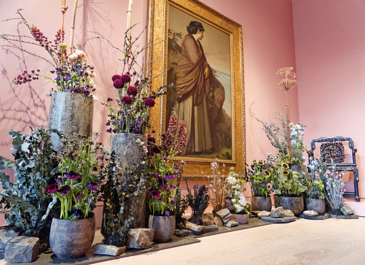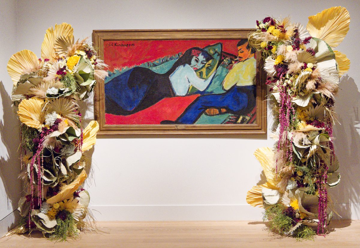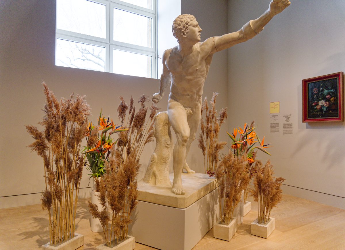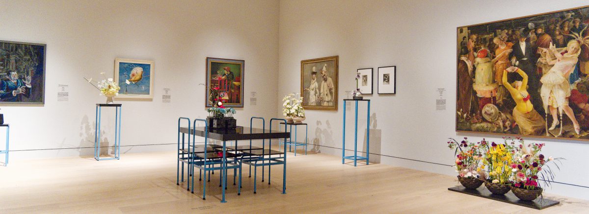 Rund 30 florale Kreationen sind neben den im Rundgang ausgestellten Objekten — naturgemäß nur für kurze Zeit – zu sehen und schaffen sowohl visuell als auch olfaktorisch besondere Sinneseindrücke. Acht renommierte Florist*innen folgen der Einladung des Kunstpalastes, sich mit der Sammlung auseinanderzusetzen und Interpretationen zu entwickeln, die sich auf einzelne Werke oder ganze Räume des Rundgangs beziehen.