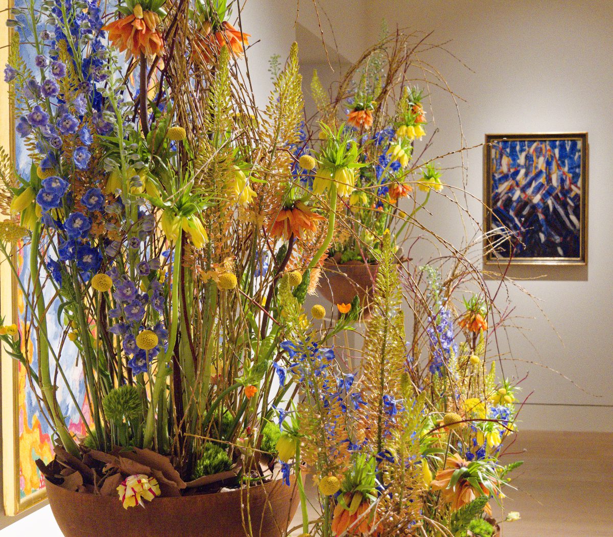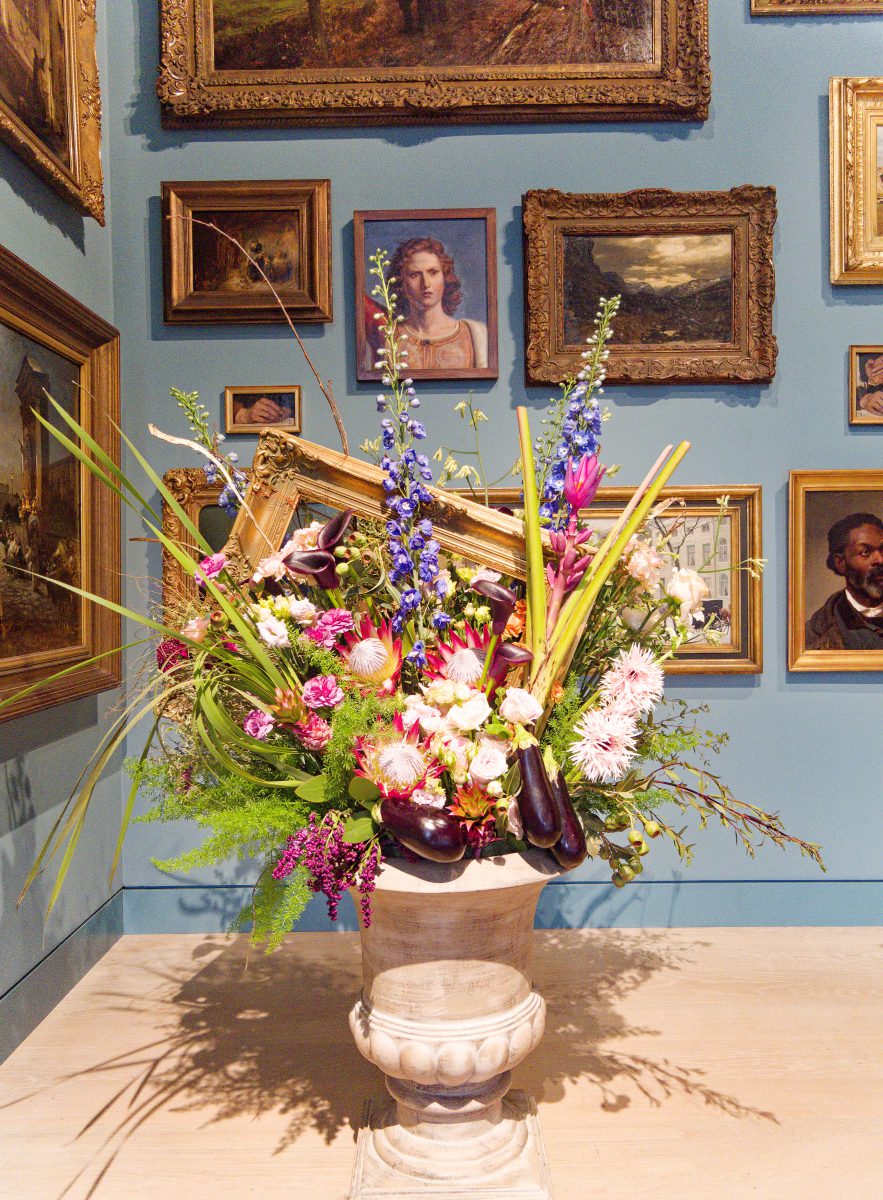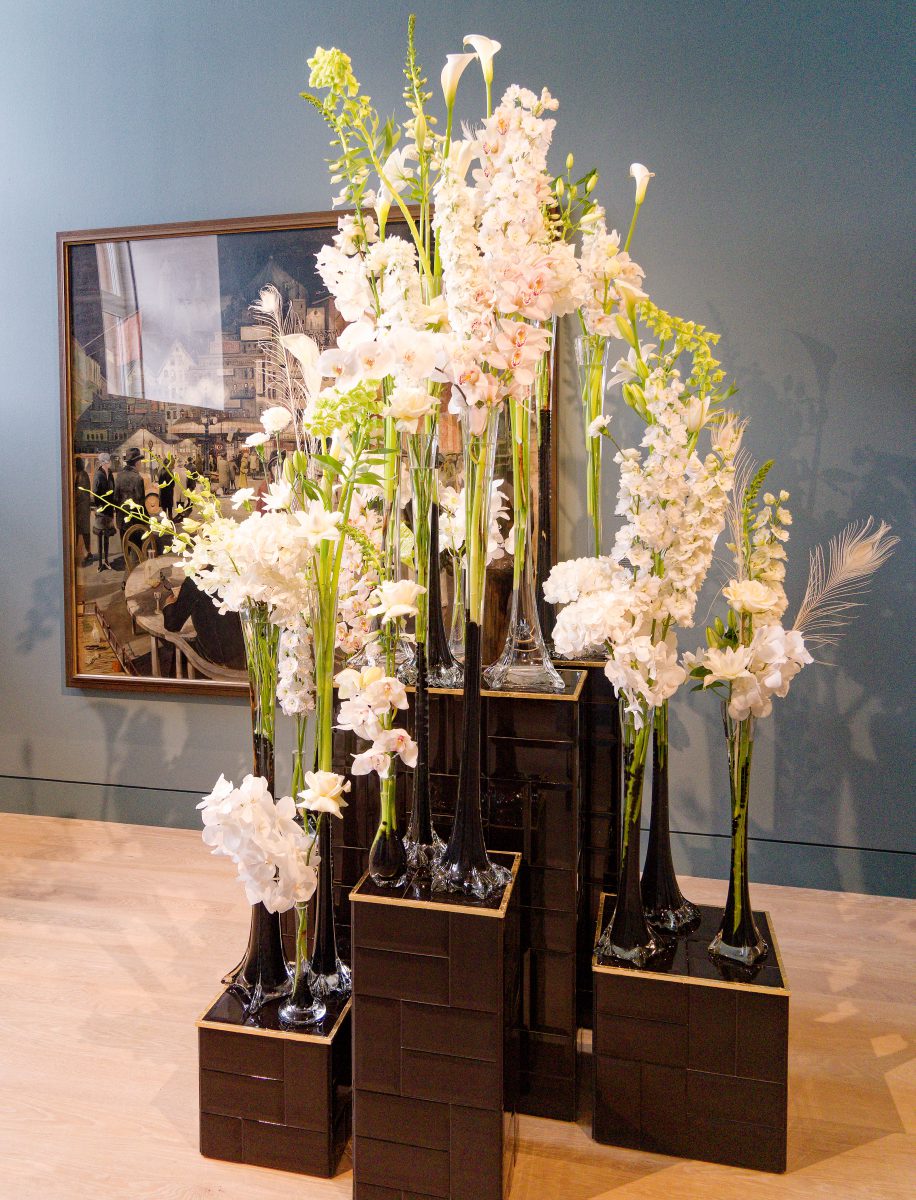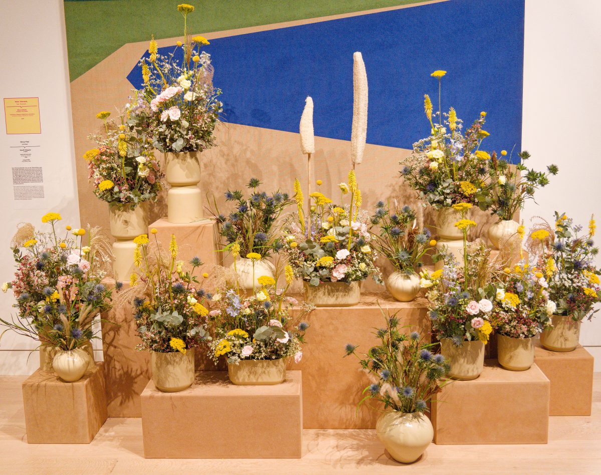 Rund 30 florale Kreationen sind neben den im Rundgang ausgestellten Objekten — naturgemäß nur für kurze Zeit – zu sehen und schaffen sowohl visuell als auch olfaktorisch besondere Sinneseindrücke. Acht renommierte Florist*innen folgen der Einladung des Kunstpalastes, sich mit der Sammlung auseinanderzusetzen und Interpretationen zu entwickeln, die sich auf einzelne Werke oder ganze Räume des Rundgangs beziehen.