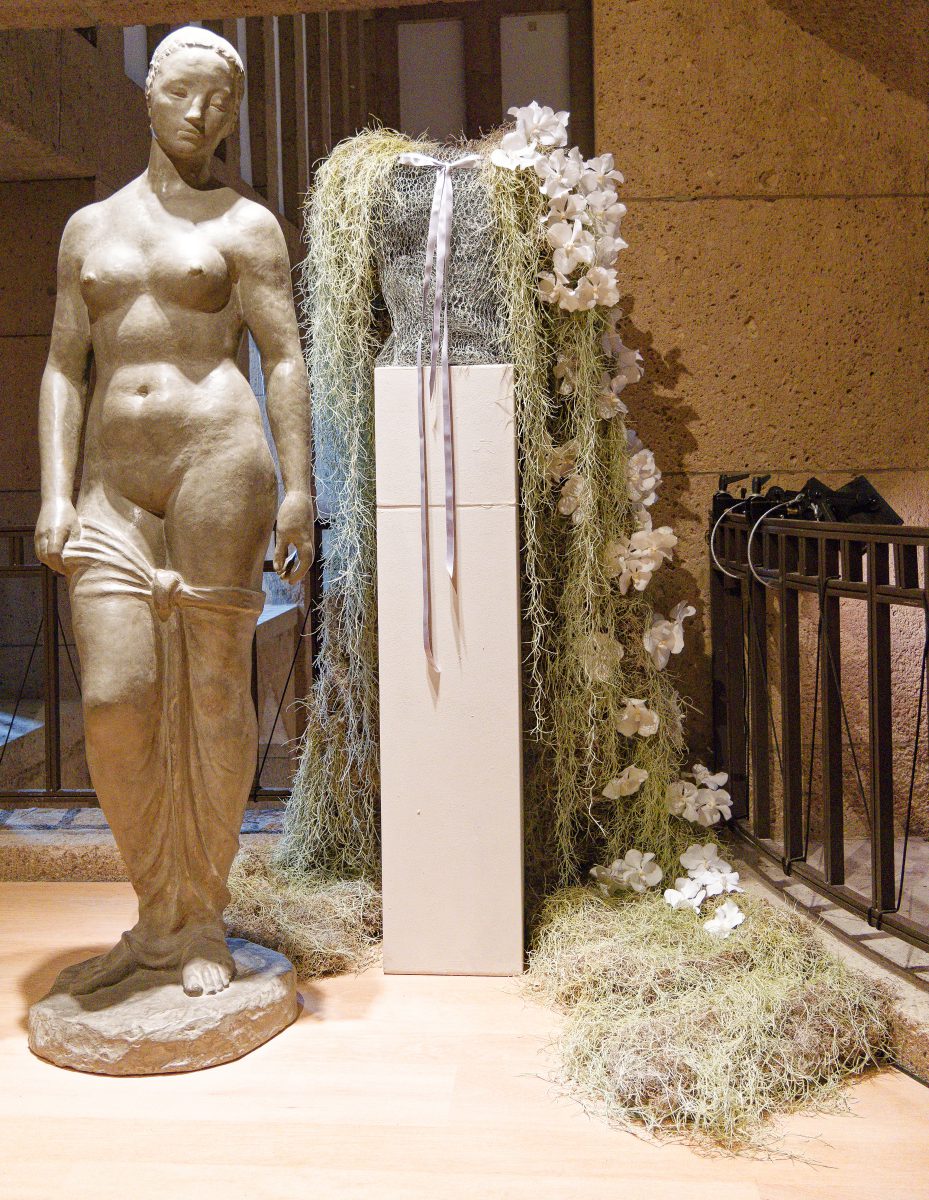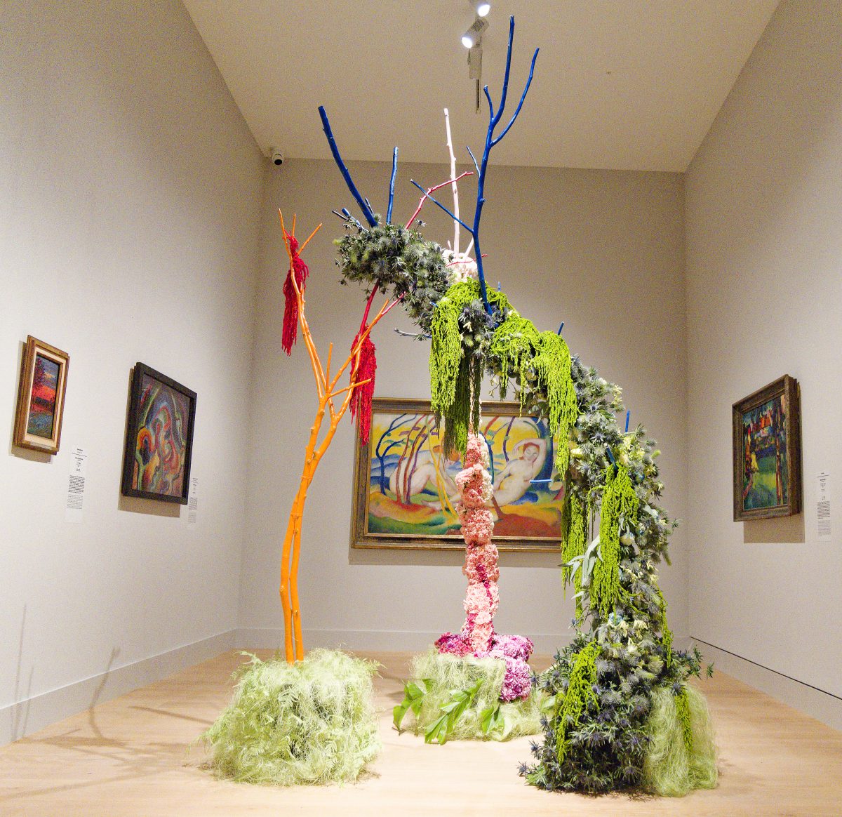 Bei der Auswahl der Räume und Werke sowie der Gestaltung ihrer korrespondierenden Blumenarrangements haben die Florist*innen freie Hand. Das Blumenhaus am Hofgarten erinnert vorm Altarbild zu Beginn des Sammlungsrundgangs mit Pfaffenhütchen an die ersten Orgeln, diein der Renaissance Einzug in deutsche Kirchen hielten und deren Orgelpfeifen damals aus dem Holz dieser Pflanze geschnitzt wurden. In einen großen Baumstamm werden Orgelpfeifen und Pfaffenhütchenäste gestellt und diese Konstruktion mit Rosen, Ilex und Blumen ergänzt, die eine religiöse Bildsprache evozieren.