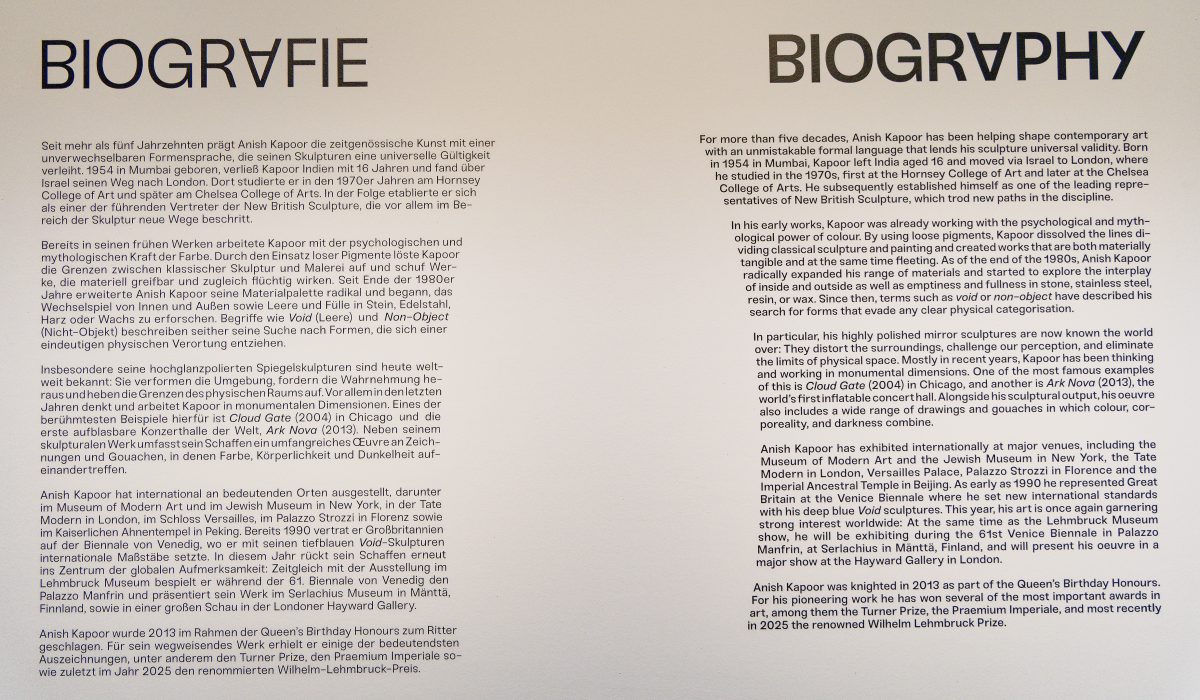 Anish Kapoor hat international an bedeutenden Orten ausgestellt, darunter im Museum of Modern Art und im Jewish Museum in New York, in der Tate Modern in London, im Schloss Versailles, im Palazzo Strozzi in Florenz, sowie im Kaiserlichen Ahnentempel in Peking. Bereits 1990 vertrat er Großbritannien auf der Biennale von Venedig, wo er mit seinen tiefblauen Void-Skulpturen internationale Maßstäbe setzte. In diesem Jahr rückt sein Schaffen erneut ins Zentrum der globalen Aufmerksamkeit: Zeitgleich mit der Ausstellung im Lehmbruck Museum bespielt er während der 61. Biennale von Venedig den Palazzo Manfrin und präsentiert sein Werk im Serlachius Museum in Mänttä, Finnland, sowie in einer großen Schau in der Londoner Hayward Gallery.